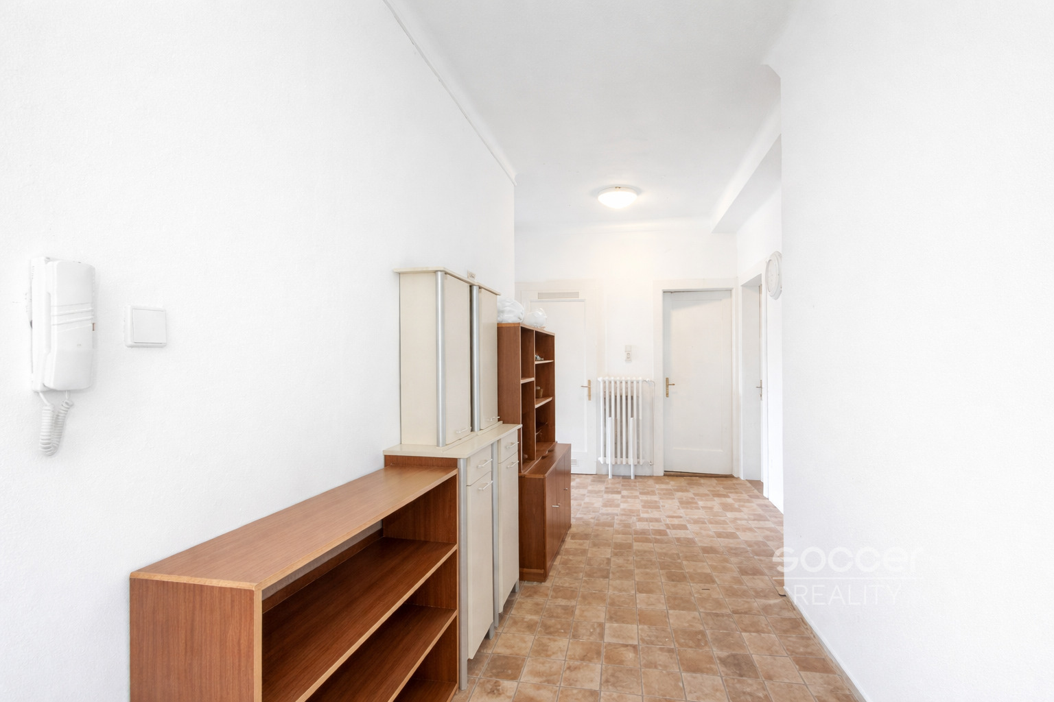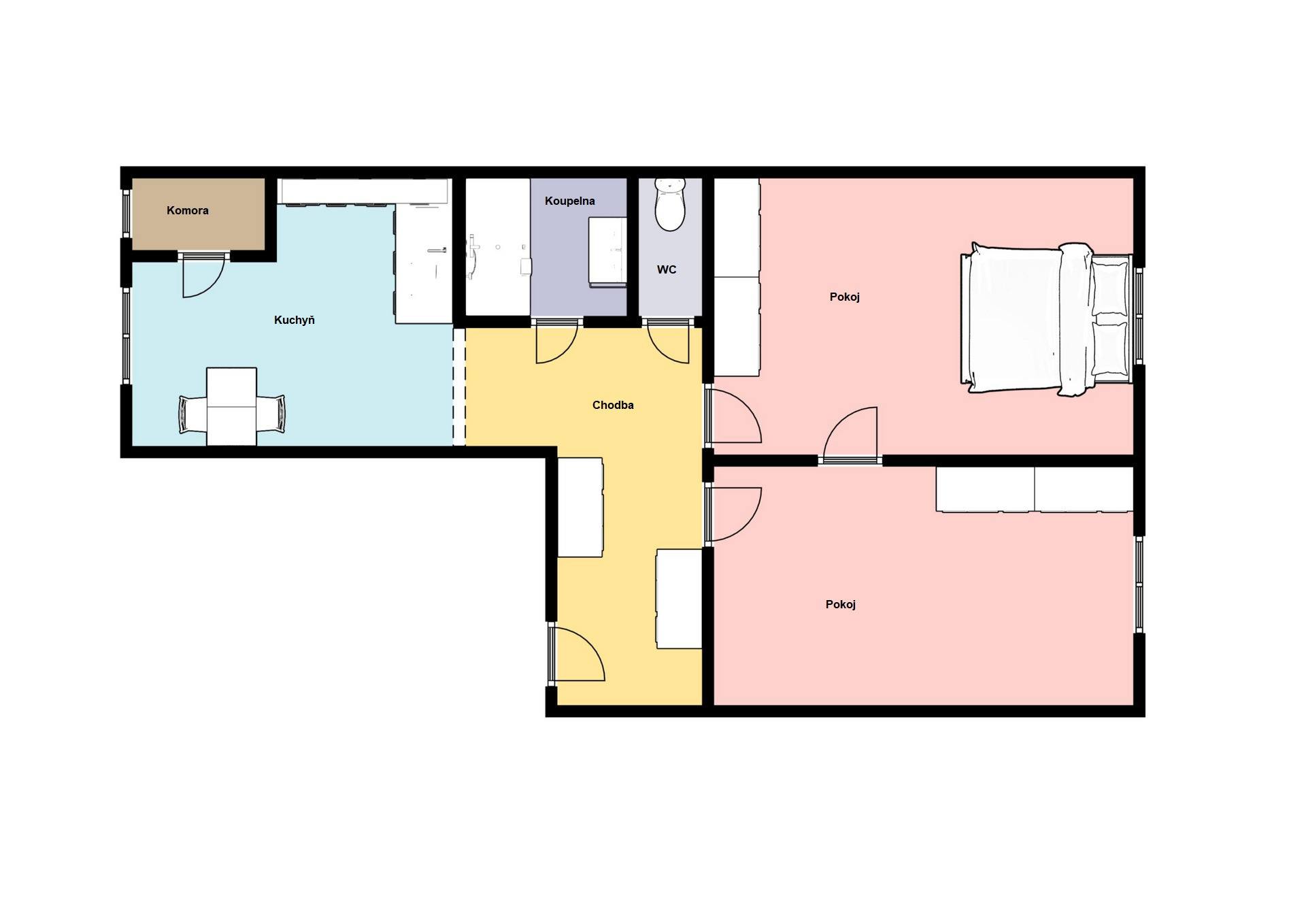 Ze vstupní chodby je přístup do obou neprůchozích pokojů. Kuchyně s kuchyňskou linkou je rovněž samostatná.