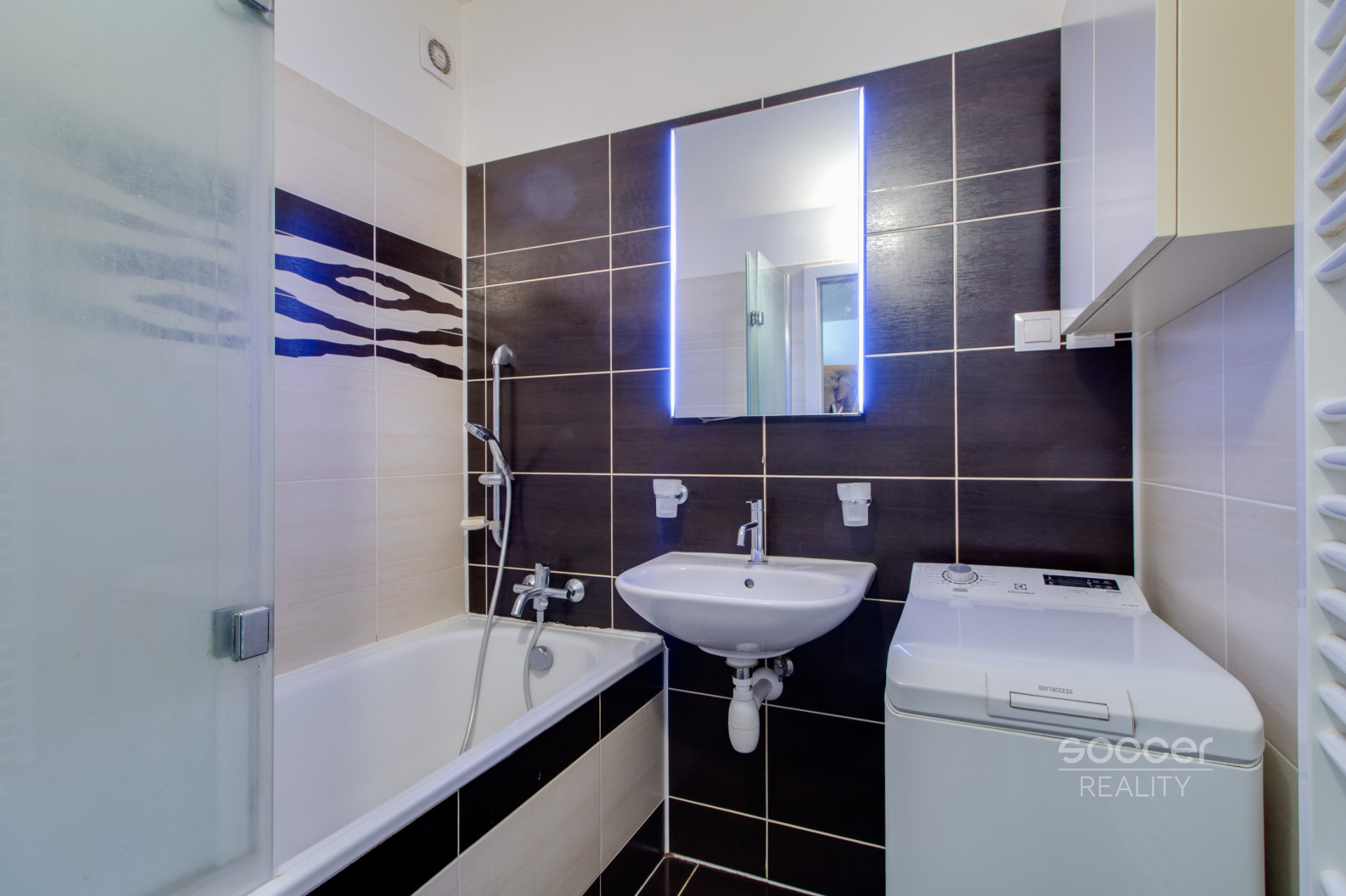 Interiér bytu byl navržen s důrazem na vkus, kvalitu a praktičnost a je nabízen jako kompletně zařízený. Dominantou je plně vybavená kuchyňská linka se všemi moderními spotřebiči. Byt je vybaven i vestavěnými skříněmi, které nabízejí dostatek úložného prostoru a šetří místo v místnostech. Koupelna disponuje klasickou vanou, toaleta je řešena samostatně. V ceně nájmu je již zahrnuto internetové připojení.