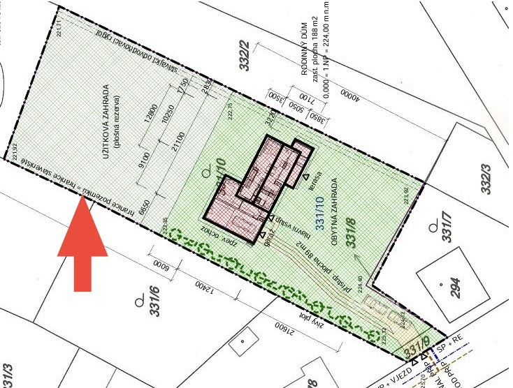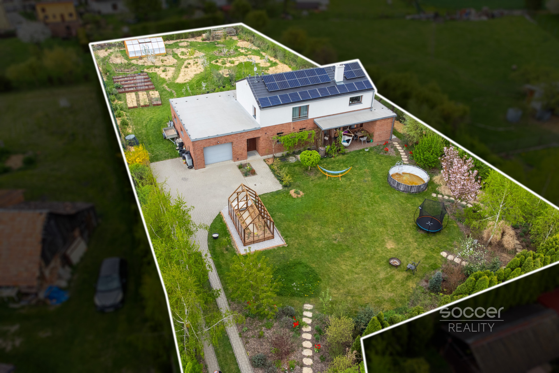 Nízkonákladový dům 5+kk, 2 koupelny, terasa, garáž pro 2 automobily + min. 4 parkovací stání, 2 sklady, pozemky celkem 2363 m2 (včetně plošné rezervy pro potenciálně další stavbu), městys Březno u Mladé Boleslavi.