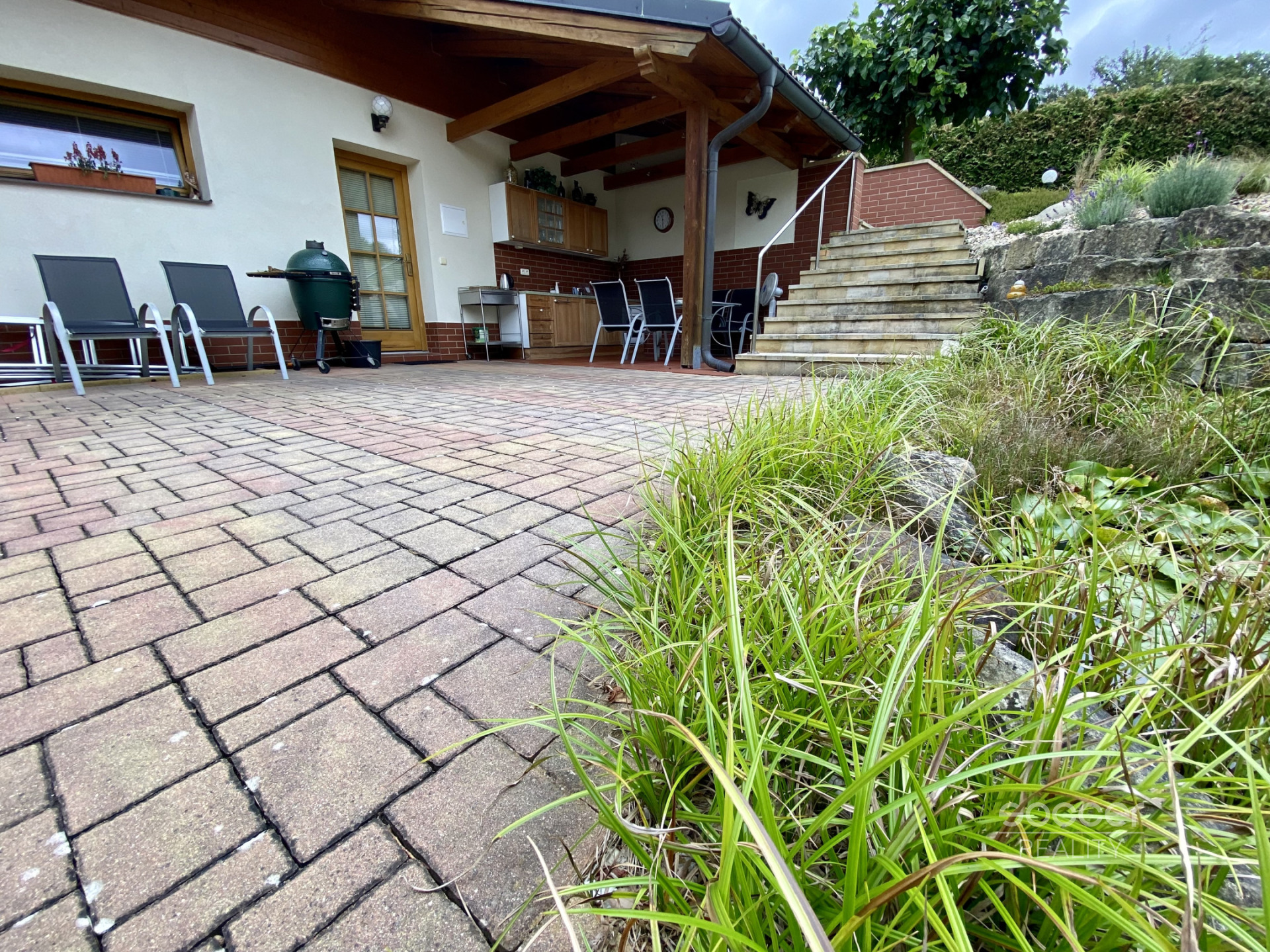 Ze všech místností máte hezký výhled do zalesněného okolí, terasa vám poskytne zázemí pro relaxaci. Zahrada u domu má parkovou úpravu a je částečně sdílená se sousedním domem. V místě můžete využívat také přírodní koupaliště. Lokalita je balzámem pro zdraví.