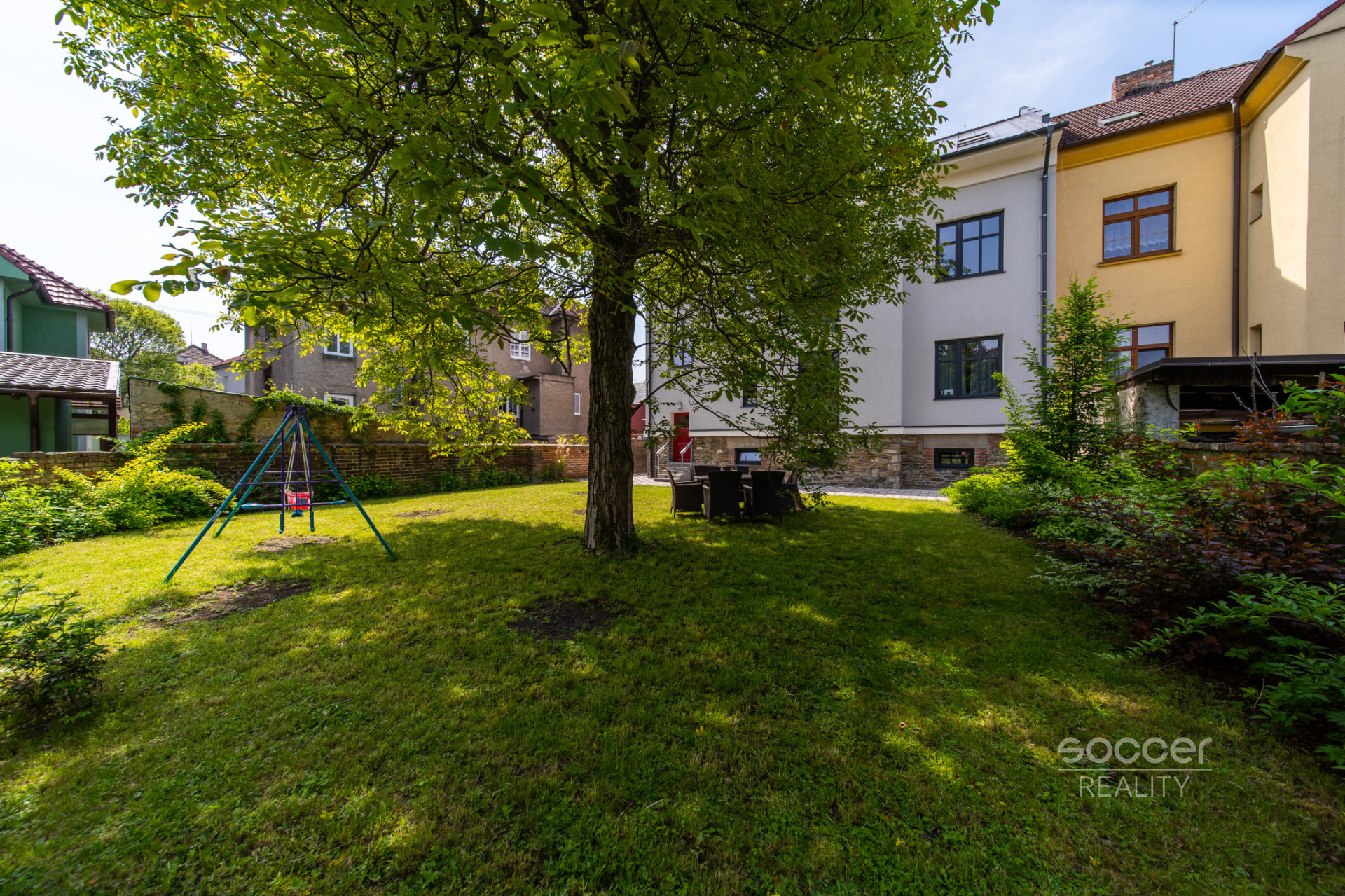 Celá nemovitost je po velmi zdařilé a vkusné rekonstrukci, zachovává vzácné původní prvky, důraz je kladen na celkovou souhru s jedinečnými designovými detaily. Samotný byt je plně zařízený a nabídne vám velký obývací pokoj s vybaveným kuchyňským koutem a krbovými kamny. Další pokoj je neprůchozí a budete z něho mít výhled do udržované zahrady, stejně jako z ložnice s velkým francouzským oknem. Dvě prostorné koupelny vám umožní volbu mezi sprchovým koutem a vanou. Interiér je světlý a vzdušný a budete mít navíc možnost pobývat v soukromí zahrady náležející k vile.