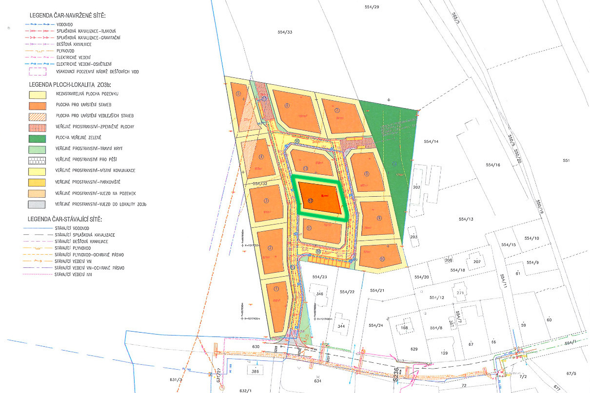 Dle ÚP je zde schválena částečně uspořádaná zástavba, výška zástavby max. 1+P (podmínečně 2+P), aktuálně je již uhrazena projektová dokumentace pro inženýrské sítě (vodovod, kanalizace, plynovod, elektřina, příjezdové cesty, osvětlení), k dispozici je podrobná územní studie (možno poskytnout), probíhá výběr zhotovitele pro realizaci kompletních sítí v rámci všech parcel.