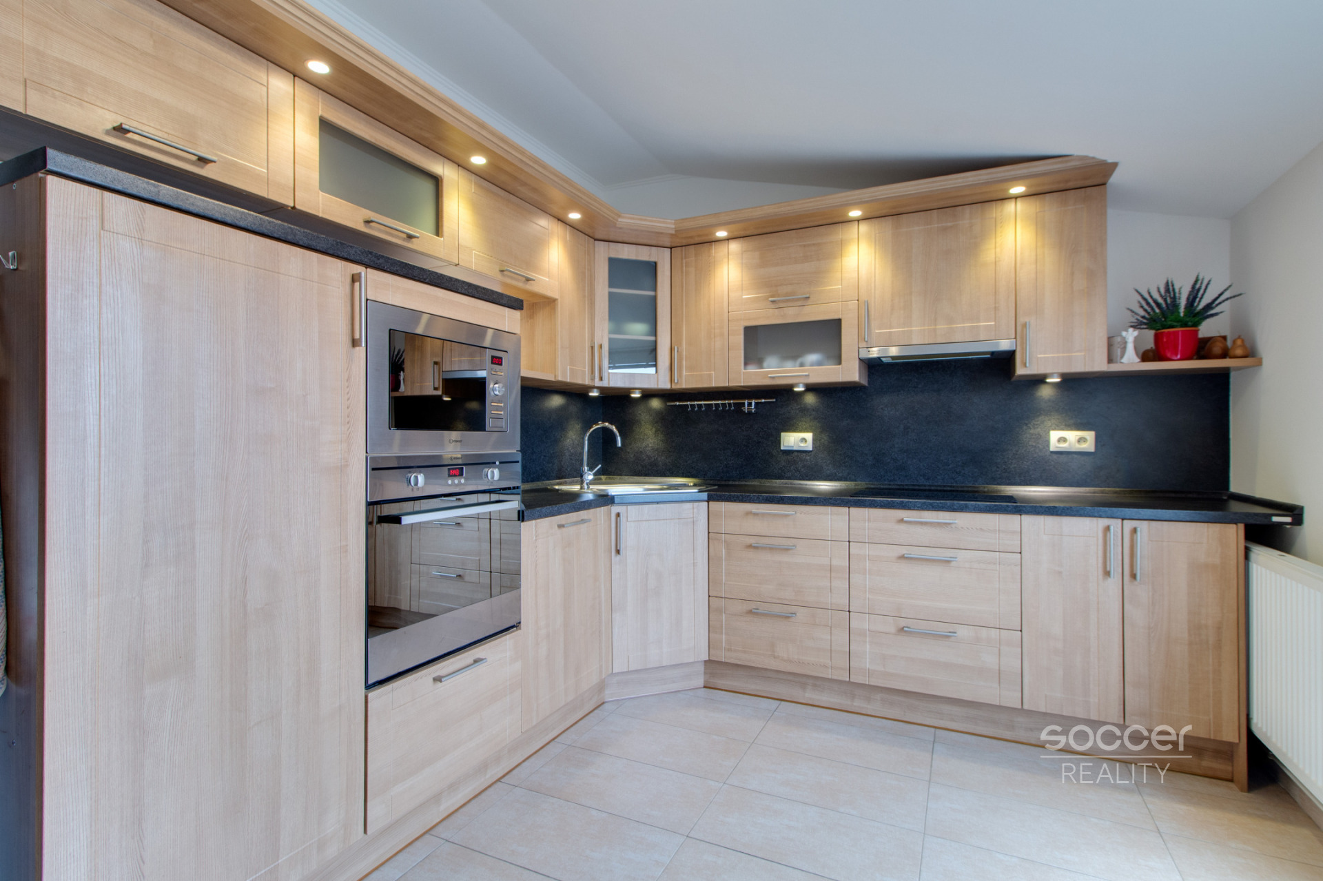 Interiér bytu byl navržen s důrazem na vkus, kvalitu a praktičnost a je nabízen jako kompletně zařízený. Dominantou je plně vybavená kuchyňská linka se všemi moderními spotřebiči. Byt je vybaven i vestavěnými skříněmi, které nabízejí dostatek úložného prostoru a šetří místo v místnostech. Koupelna disponuje klasickou vanou, toaleta je řešena samostatně. V ceně nájmu je již zahrnuto internetové připojení.